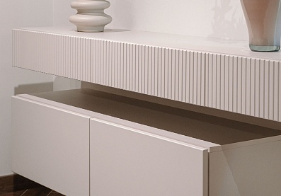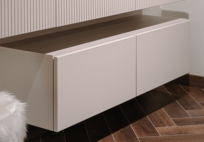 - Для выдвижных ящиков используется система скрытых направляющих со встроенным демпфером, что обеспечивает более высокие потребительские свойства.