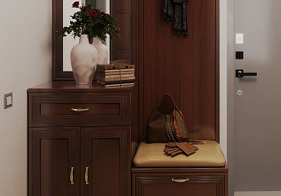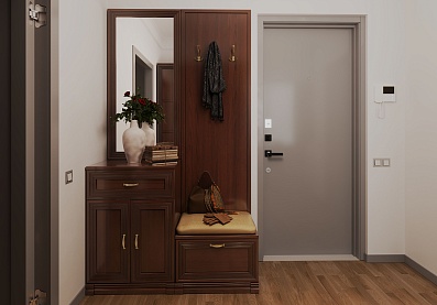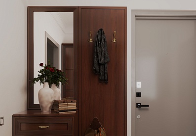 - Для хранения в спальне есть три удобных шкафа, один из которых с двумя зеркалами. Благодаря этому вы можете увидеть свой образ сразу после переодевания, не выходя в ванную или коридор;