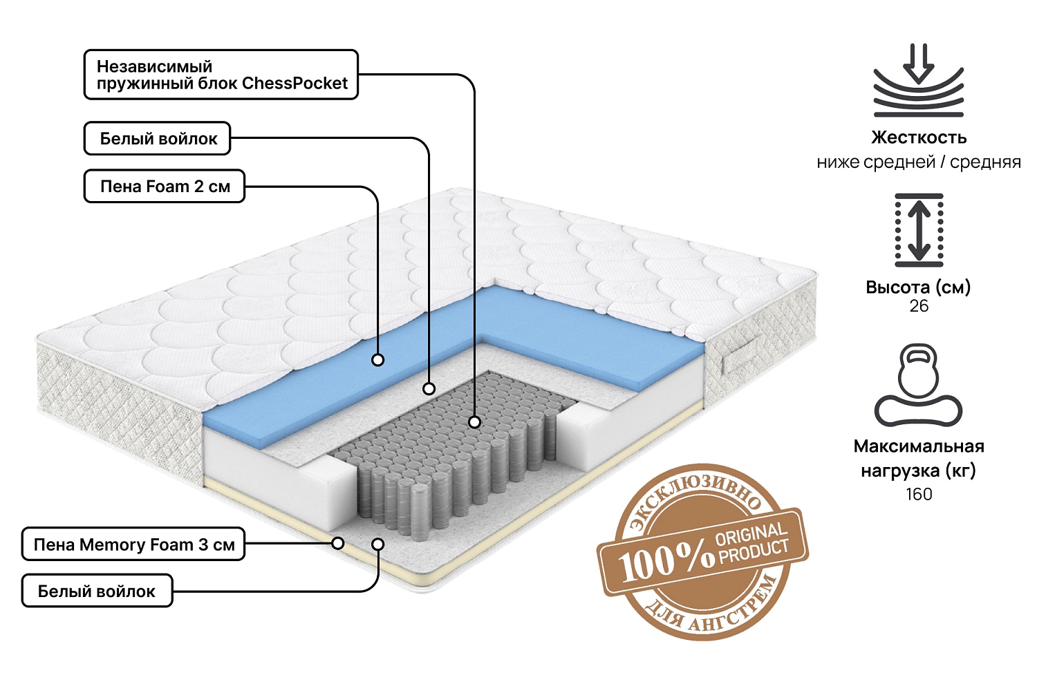 Двусторонний матрас Prestige обладает разным уровнем жесткости сторон. Благодаря блоку независимых пружин ChessPoket, расположенных в шахматном порядке, обеспечивается оптимальная поддержка позвоночника во время сна. Идеальное решение для тех, кто ценит комфорт и разнообразие ощущений во сне. Каждая пружина работает отдельно от остальных, обеспечивая точечную поддержку тела и минимизируя передачу движений. Мягкая сторона с эффектом памяти, которая адаптируется к форме тела и эффективно снимает мышечное напряжение. Вторая - более твердая, с использованием гипоаллергенного материала Foam, обеспечивает отличную поддержку позвоночнику.